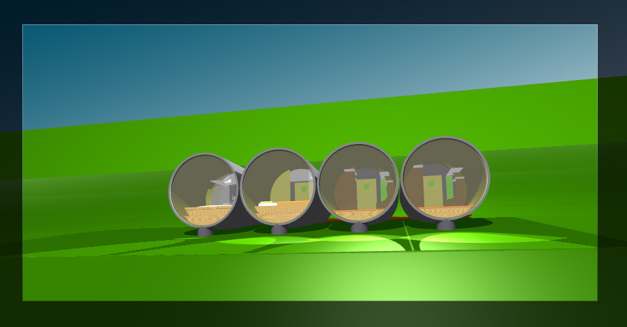 Early layout concept - kitchen in forground, bed/couch in the middle and toilet/shower at the back