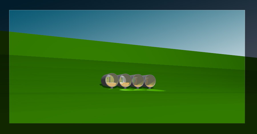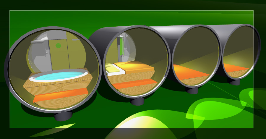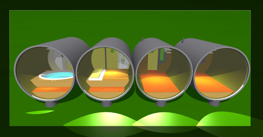 Early layout concept - kitchen in forground, bed/couch in the middle and toilet/shower at the back